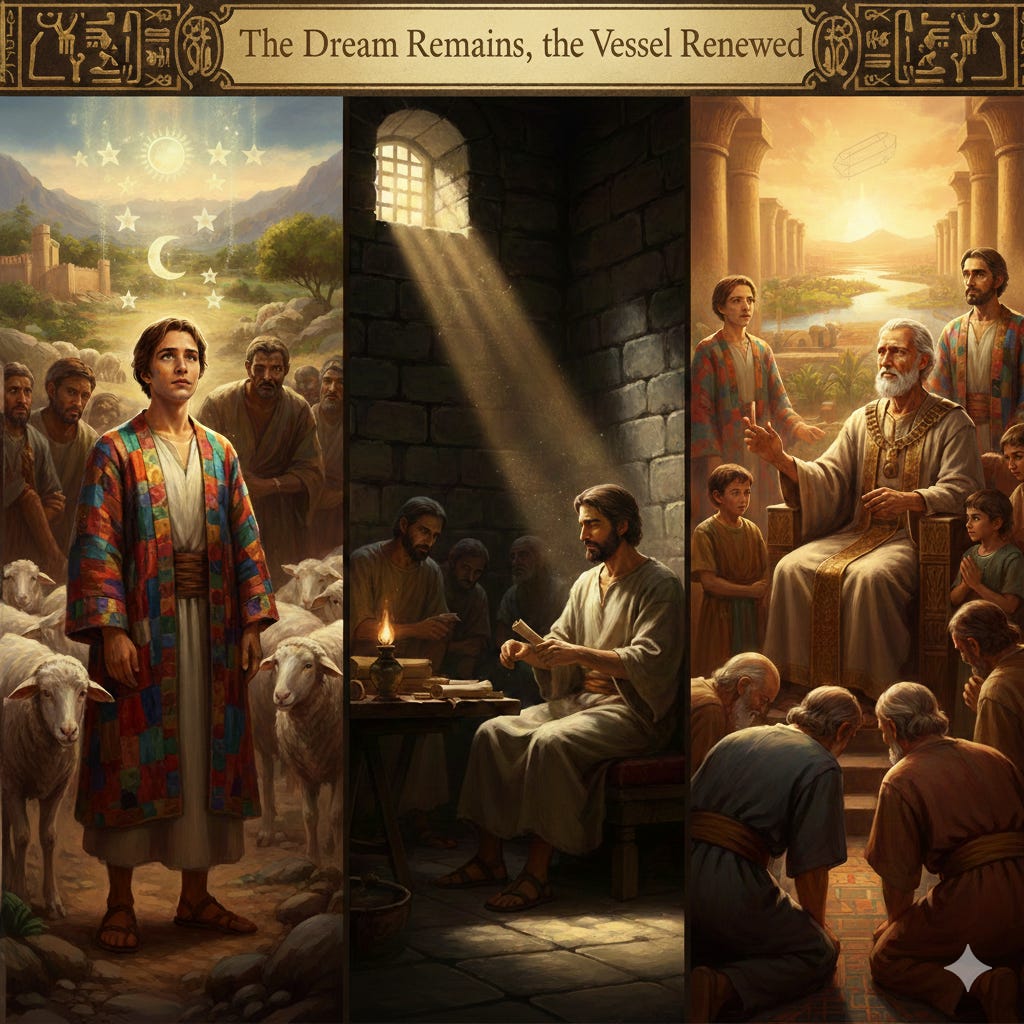 神并未收回约瑟的异梦,而是在时间的熔炉中升级了承载异梦的器皿——以属世的老练与情感的深度,配合属灵之光,使他成为义的管家。